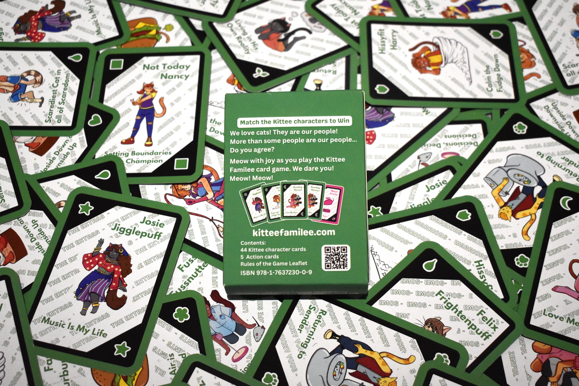 * This GREEN collection can be played by itself or it can be made into an even more challenging game by adding any other Kittee Familee card deck to mix it up. It makes it so much more fun for everyone.